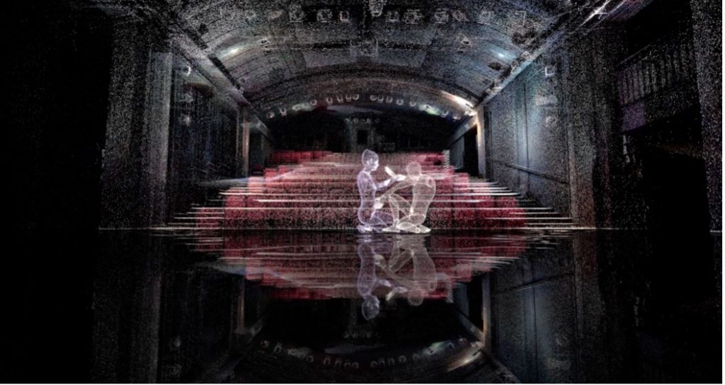 In einem kugeligen Sessel setze ich die VR-Brille auf und lehne mich bequem zurück. Ich starre auf die Wolke, die vor mir flirrt. „Du musst durch die Wolke!“ wird mir zugerufen. Mit einem Tool in jeder Hand kann ich mich bewegen und schaffe es in die Wolke hinein: Plötzlich erscheint ein riesiger, hoher Theatersaal. Ich befinde mich oben, hinter den absteigenden Sitzreihen, und schaue auf eine schwarze Wasserfläche – den Saalboden.