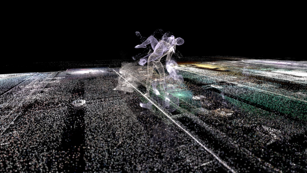 Langsam bewege ich mich nach unten, nähere mich dem Boden – dort erscheinen zwei tanzende, eng umschlungene Menschengestalten. Sie tanzen in stetem, wechselndem Körperkontakt und ich kann mithilfe der Steuerelemente meine beobachtende Position wechseln.