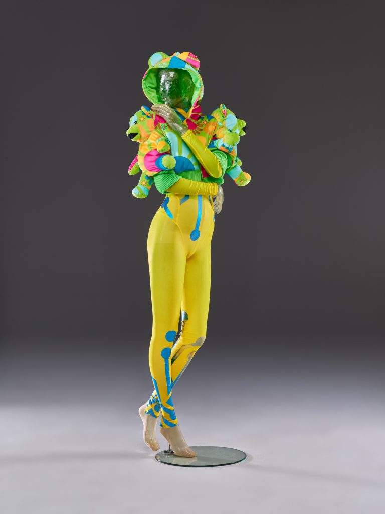 Zu einem hautengen elastischen Catsuit mit grafischen Metallic-Elementen kombiniert Susanne Bartsch eine Plüsch-Jacke mit Teddybären und tritt damit in einem typischen Techno-Look auf.