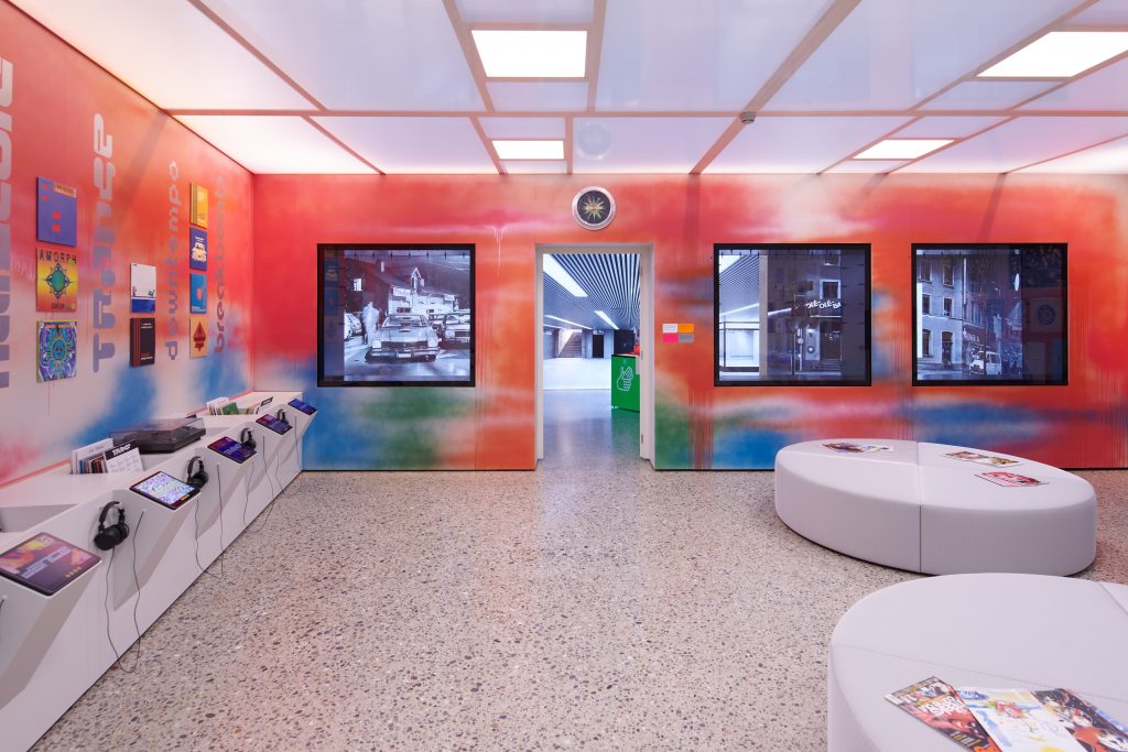 Music Ein inszenierter Plattenladen lädt zum Hören und Sehen ein und gibt Einblick in die akustische und visuelle Entwicklung der Technomusik und ihrer visuellen Erscheinung durch Plattenhüllen, Plakate usw.